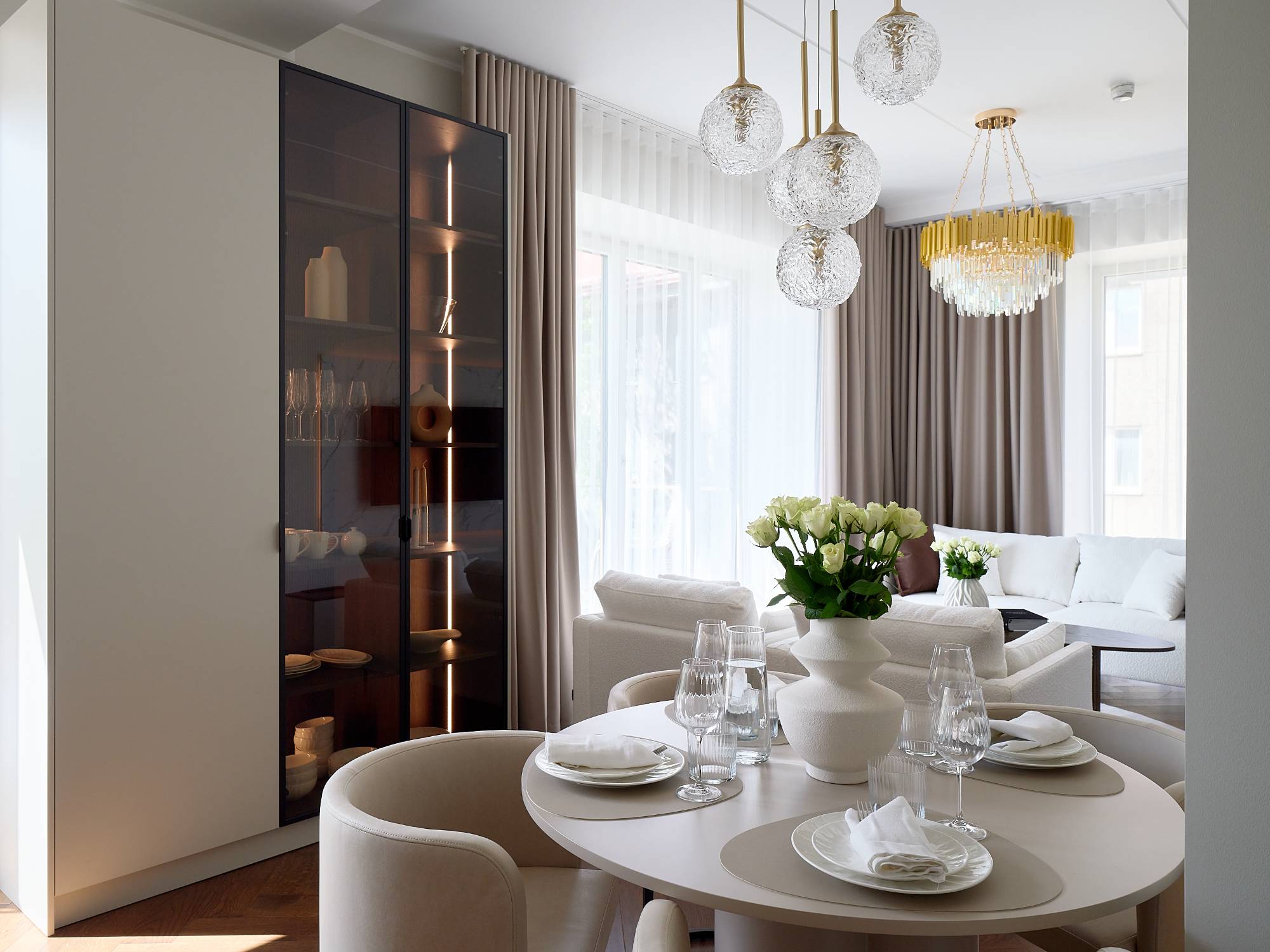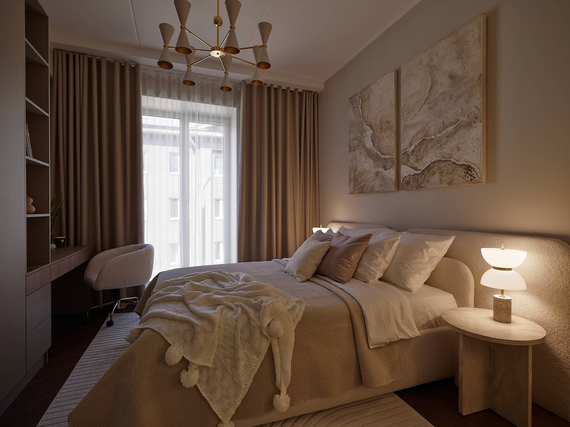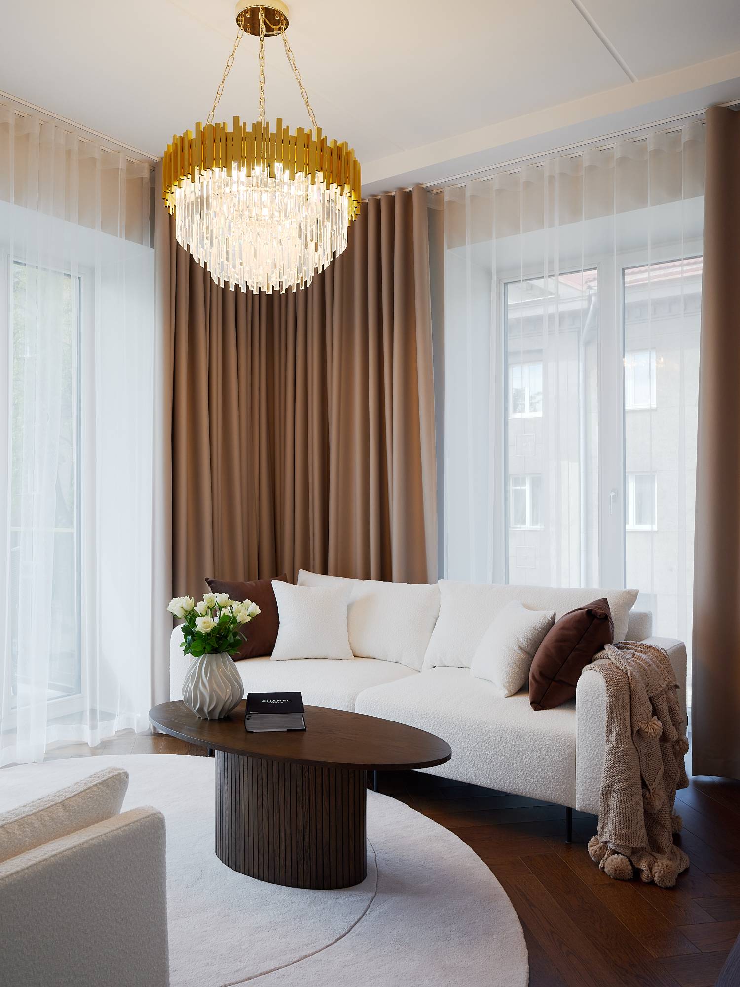 Interjööris domineerivad pruunid, beežid ja pastelsed toonid, mis loovad rahuliku ja monokroomse värviharmoonia. Iga detail – valgustusest mööblini – on valitud, et rõhutada ruumi väärikat iseloomu ja kaasaegset mugavust.