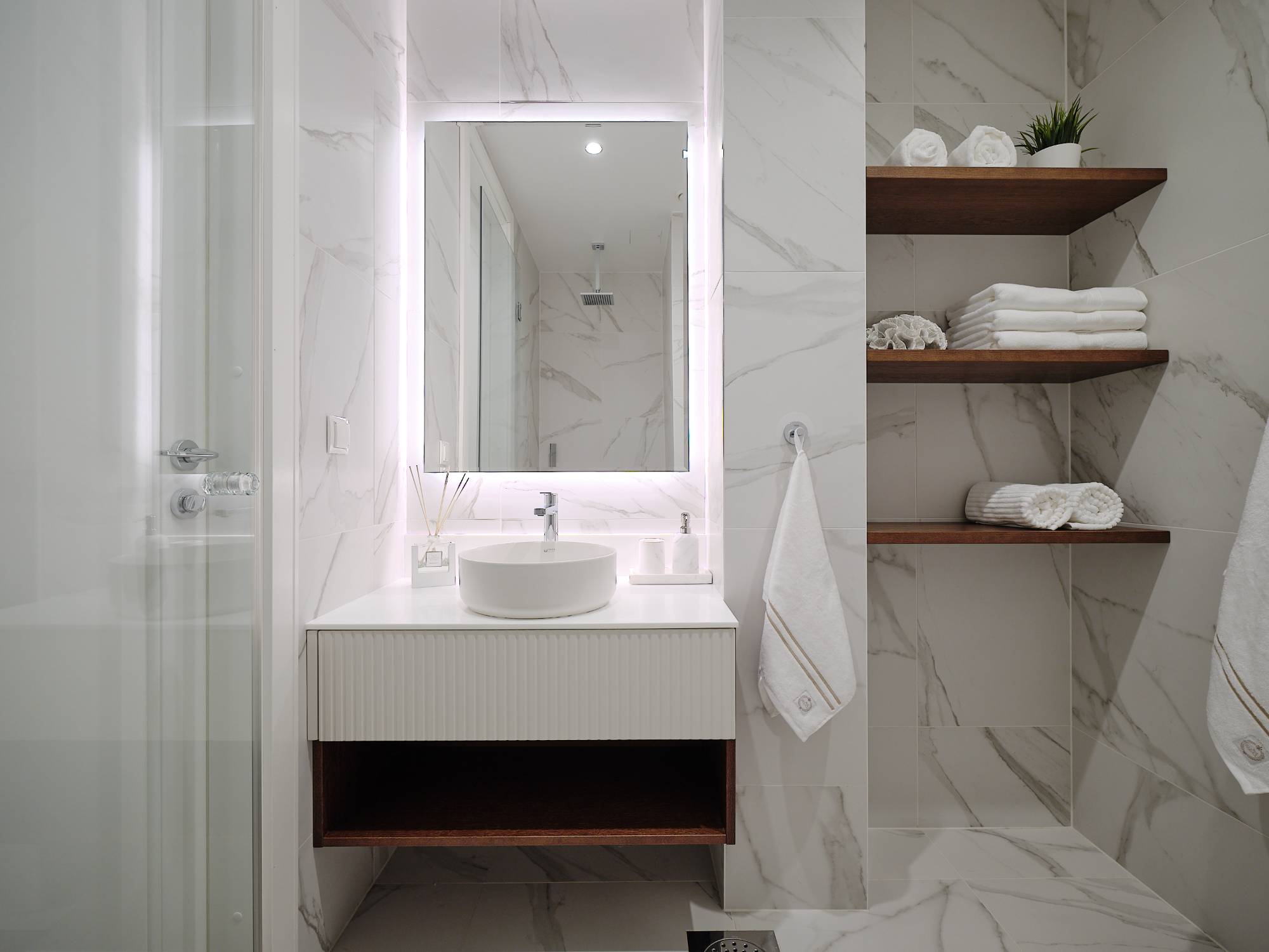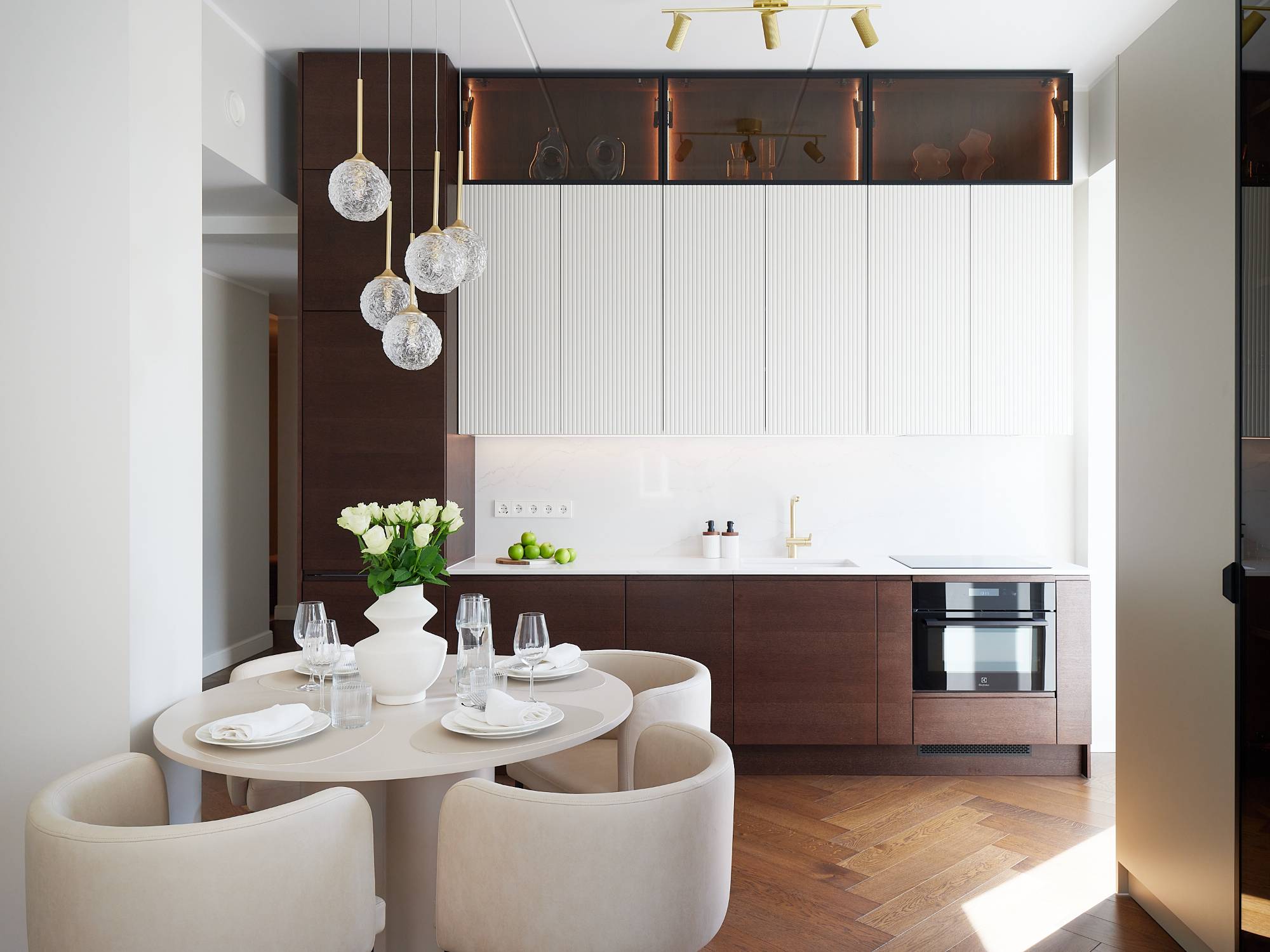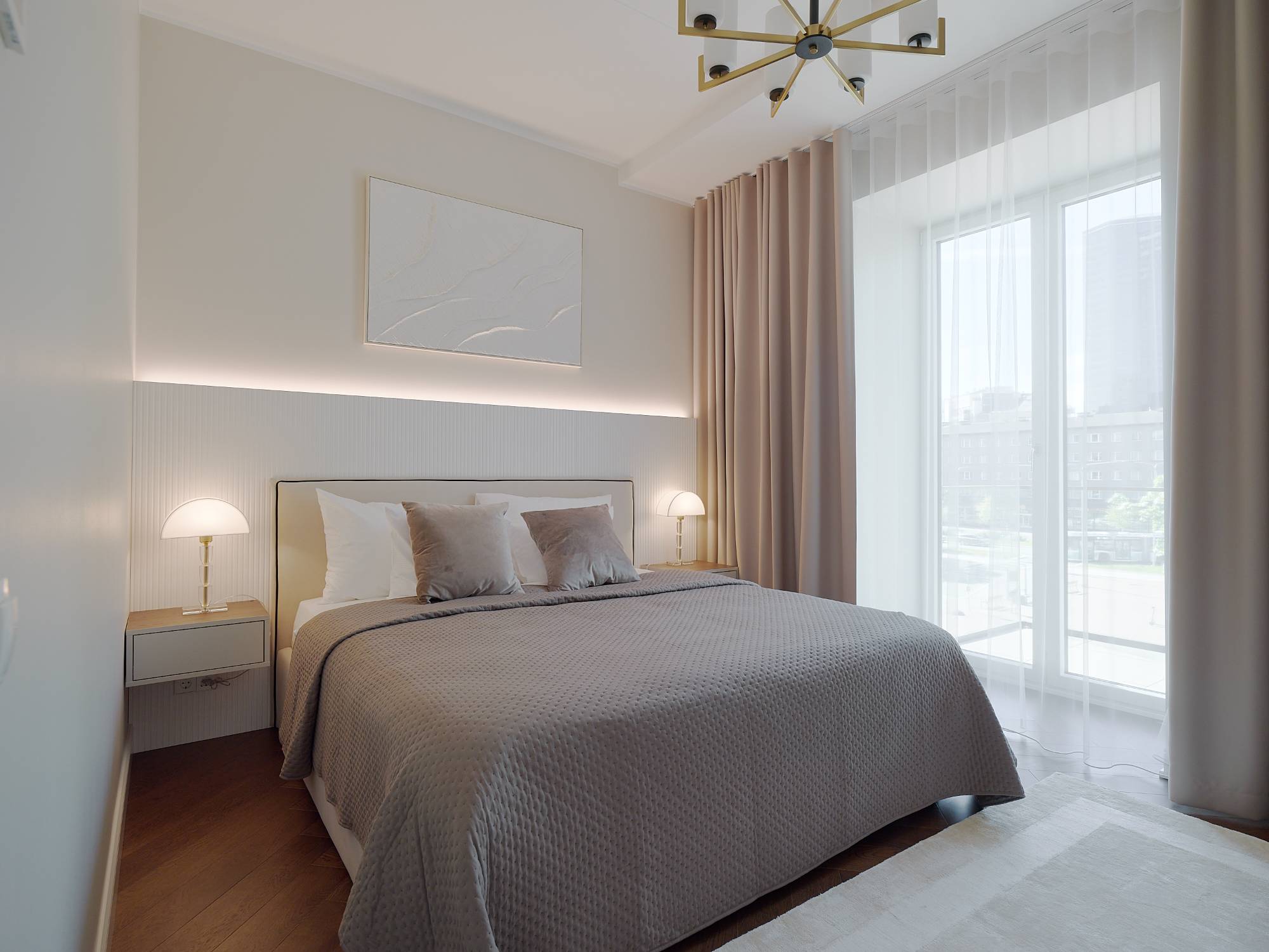Interjööris domineerivad pruunid, beežid ja pastelsed toonid, mis loovad rahuliku ja monokroomse värviharmoonia. Iga detail – valgustusest mööblini – on valitud, et rõhutada ruumi väärikat iseloomu ja kaasaegset mugavust.